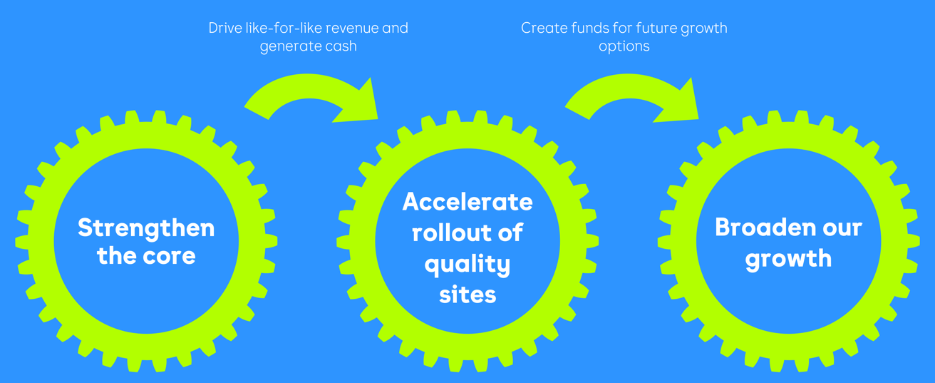 The framework of our Next Chapter growth plan is three components – firstly to ‘Strengthen the core’ of our business to increase returns from the existing estate. This funds the second part of the plan to ‘Accelerate rollout of quality sites’, in turn creating optionality to thirdly ‘Broaden our growth’ as we develop our proposition into new channels, new adjacencies and/or new markets.